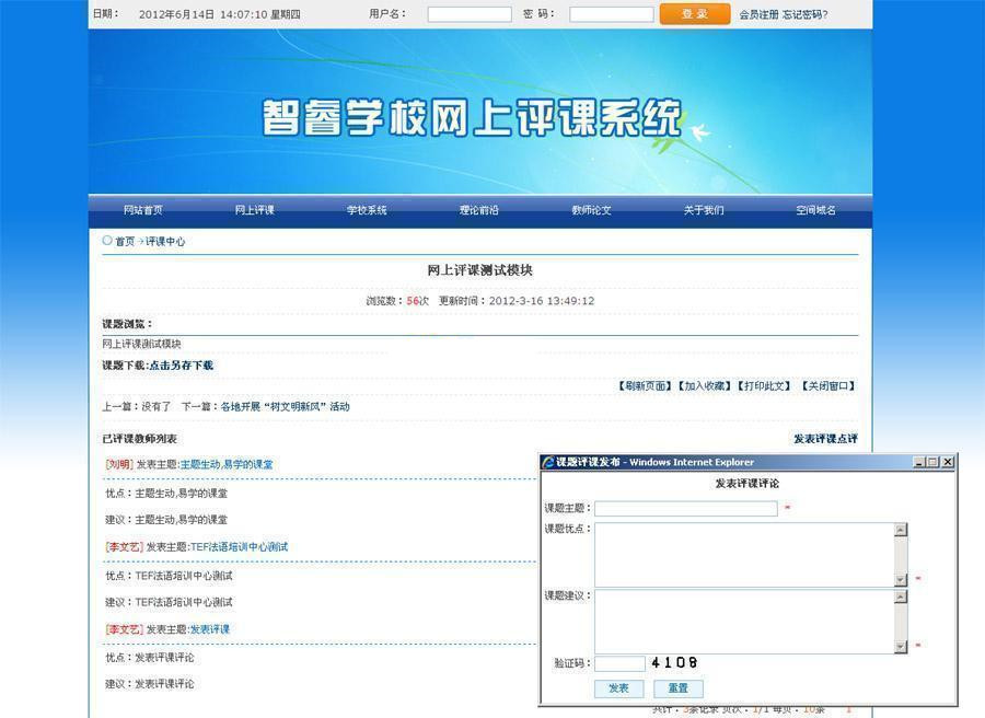智睿学校网上评课系统在教育领域运用计算机信息技术促进教育的全面改革,适应信息化社会对教育发展的新要求。智睿网上评课系统的开发使教师在线发布评课及教案评课交流系统,以交互交流形式对本学期所学课程和任课教师进行评论。以使教学管理部门及时了解教学状况,更好地改进工作。针对所有教师参与评课评教,并可以看到其他教师的评课内容,教务处批阅教师教案。
