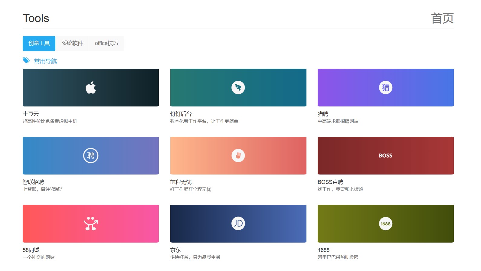 渐变背景的网址导航源码,CSS中添加了50种渐变色可供调用,boostrap响应式,鼠标hover效果,比较好看,适合做资源分享类网址导航快捷页面。