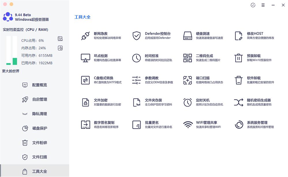 下Windows 超级管理器(详情请戳 官网)是一款免费功能强大的系统管理软件。其提供全面的系统检测,可高效地查看及了解计算机参数配置;而且附带多个实用的工具功能,即开即用且方便携带,算是开发者、电脑小白管理系统最佳利器。