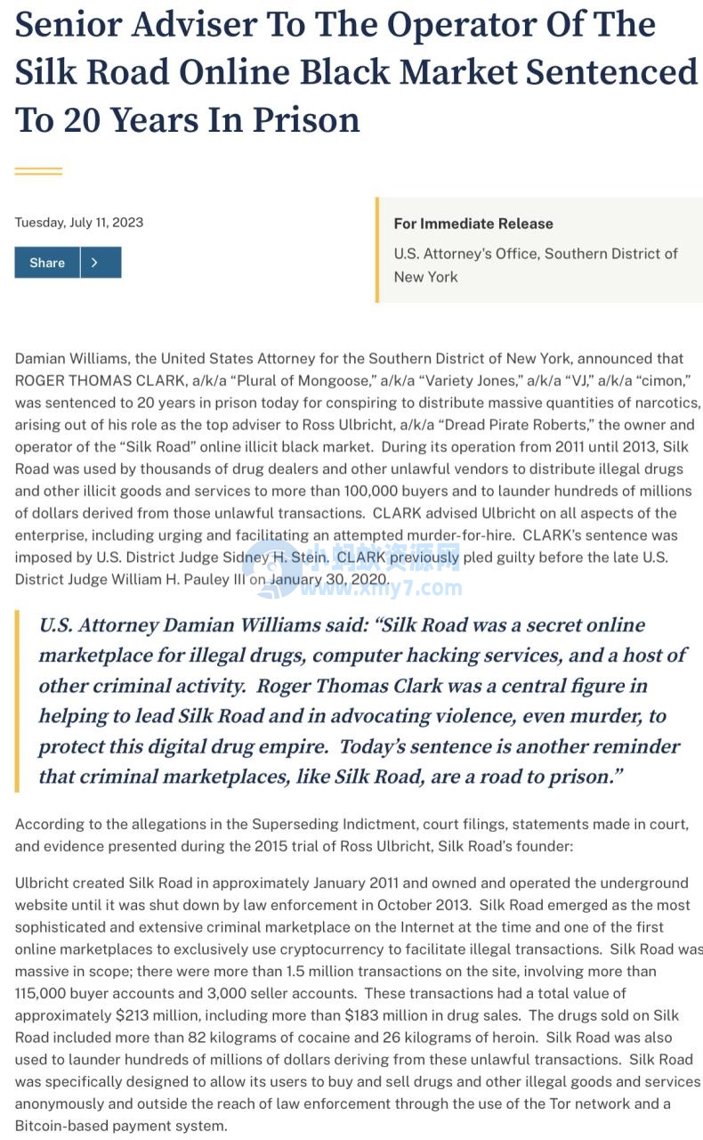 Sidney Stein 同时表示,Clark 明显有意参与 Silk Road 网站的运营,判决必须反映出他作为一个庞大犯罪组织的领导者所必然面对的后果。