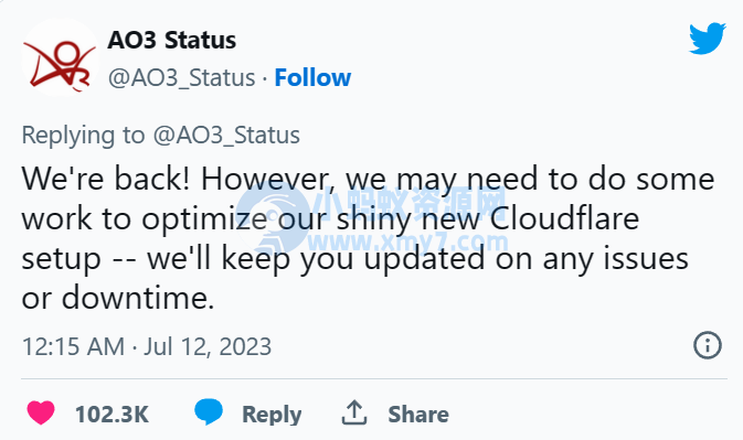 AO3 官方账号日前表示,在北京时间 7 月 11 日,网站受到了 DDoS 攻击,所有服务临时中断。在 7 月 12 日,AO3 发布推文表示,网站服务已经恢复,但“可能需要做一些工作来优化 Cloudflare 设置”。