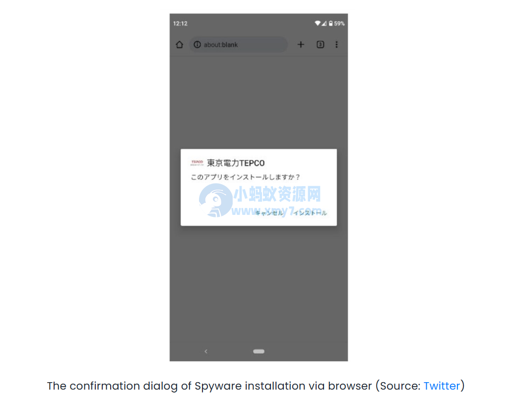 一旦用户点击链接,手机就会通过网页浏览器下载“山寨”的东京电力公司、东京都水道局 App,在安装这些山寨软件后,手机便会感染恶意木马 SpyNote。