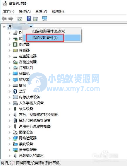 2、单击“设备管理器”后,出现设备管理器选项,选中用户名,右键选择“添加过时硬件”;