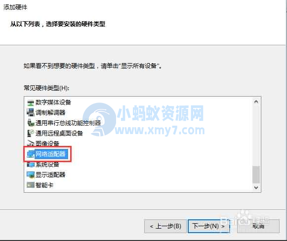 5、添加硬件,选择要安装的硬件类型,此处选择“网络适配器”,并单击下一步;