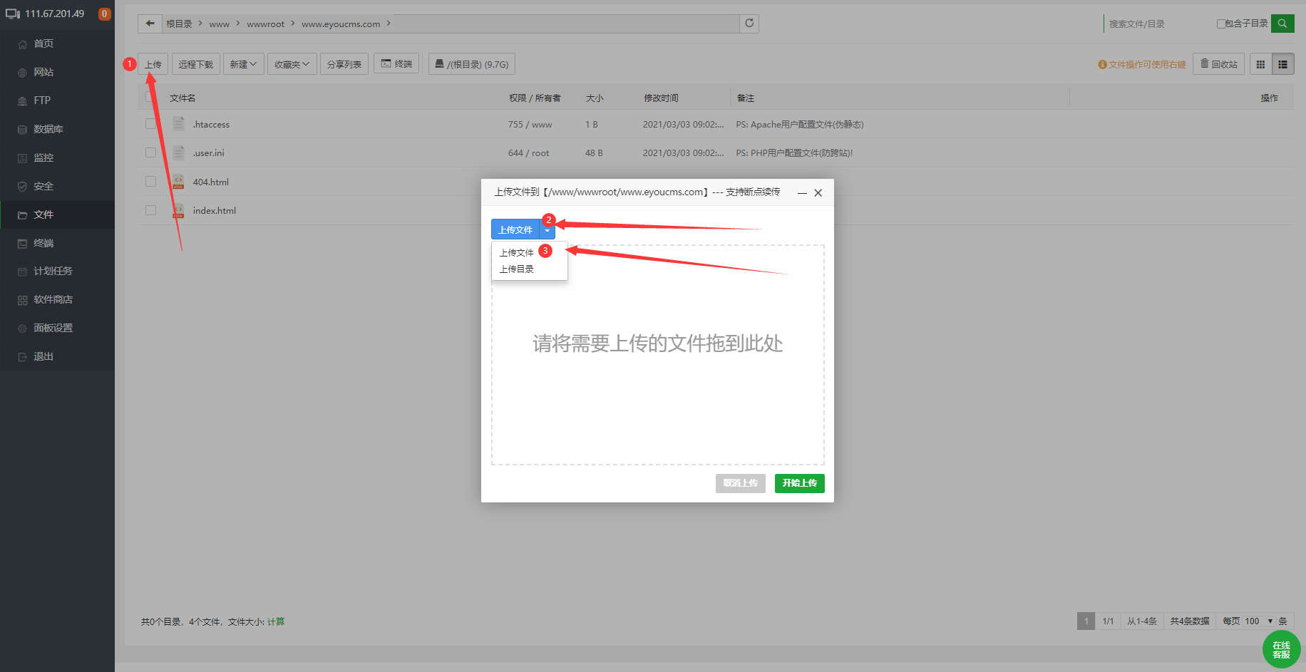 再回到宝塔管理页面,点击左侧栏菜单:“文件” 安装下图步骤顺序操作: