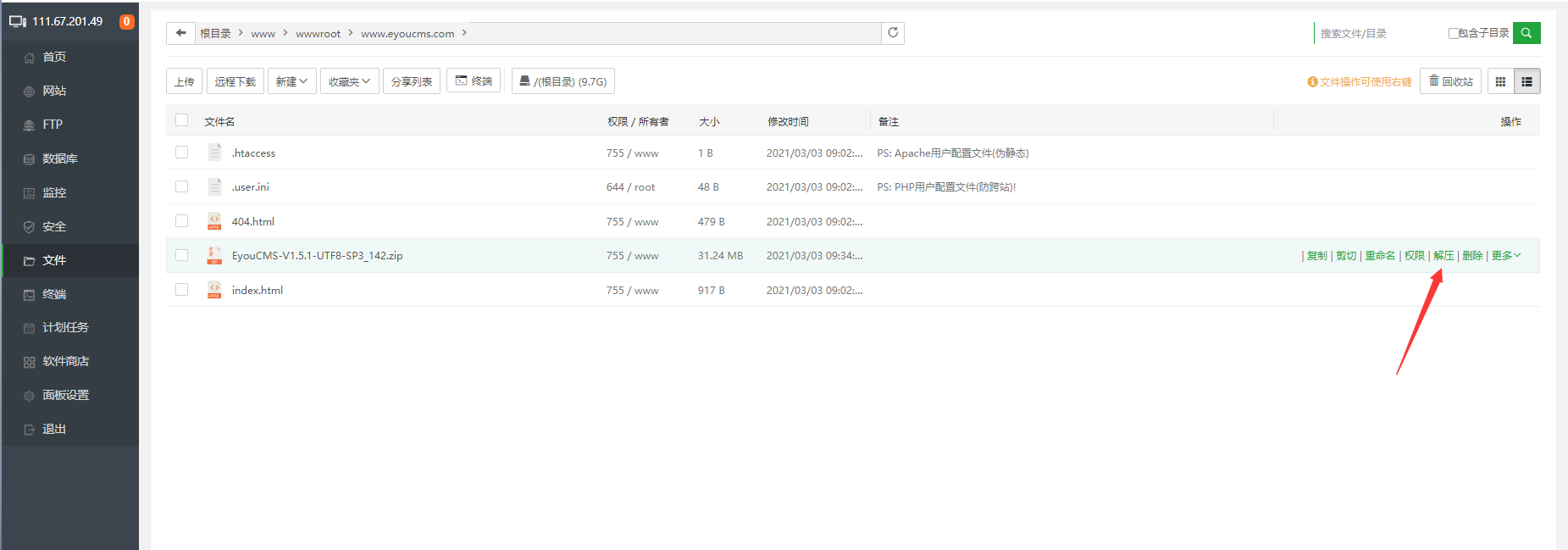 表示上传成功。然后我们要解压他这个压缩包。选择文件名后面的解压功能按钮点击他