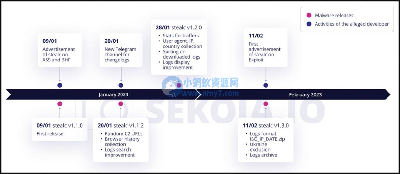 卖家还建立了一个 Telegram 频道,专门发布 Stealc 的新版本更新日志,最新版本是 2023 年 2 月 11 日发布的 v1.3.0。该恶意软件正在积极开发,每周都会在频道上出现一个新版本。