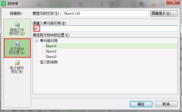 在选项卡点击“插入”–”超链接”,弹出超链接的设置窗口,点击”本文档中的位置“,在右侧”请输入单元格引用“下方输入超链接的单元格名称即可。