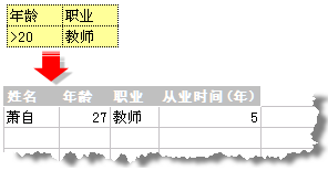 如果需要筛选符合两个以上特征的数据,可以在各特征名称下从左至右键入各个条件。如需要筛选年龄> 20,且职业为教师的数据。
