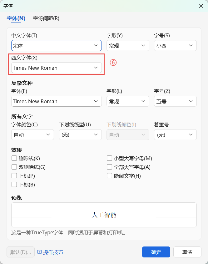 例如:想把当前文档内所有的“标题2”的西文字体改为“Times New Roman”。按照下述步骤①-⑥修改“标题2”样式的西文字体为“Times New Roman”,点完所有确定