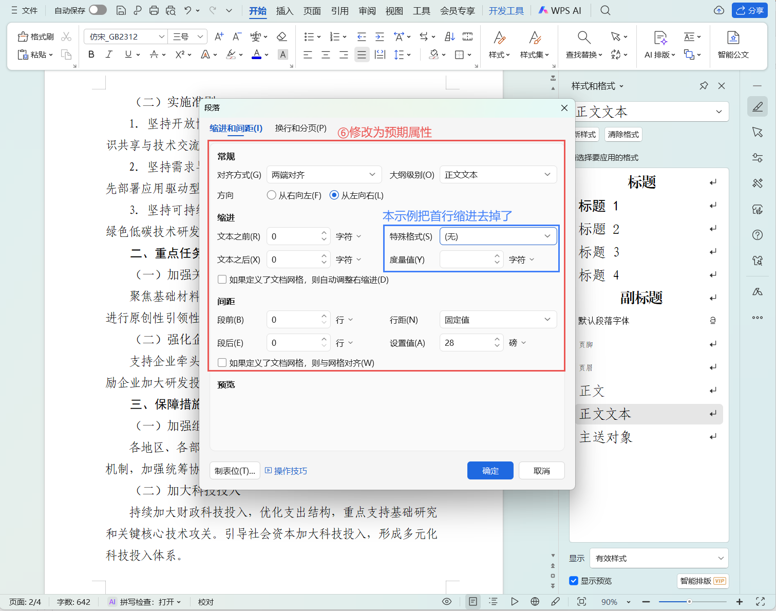 b. 可以看到文档内所有的“正文”段落首行缩进都没有2字符了
