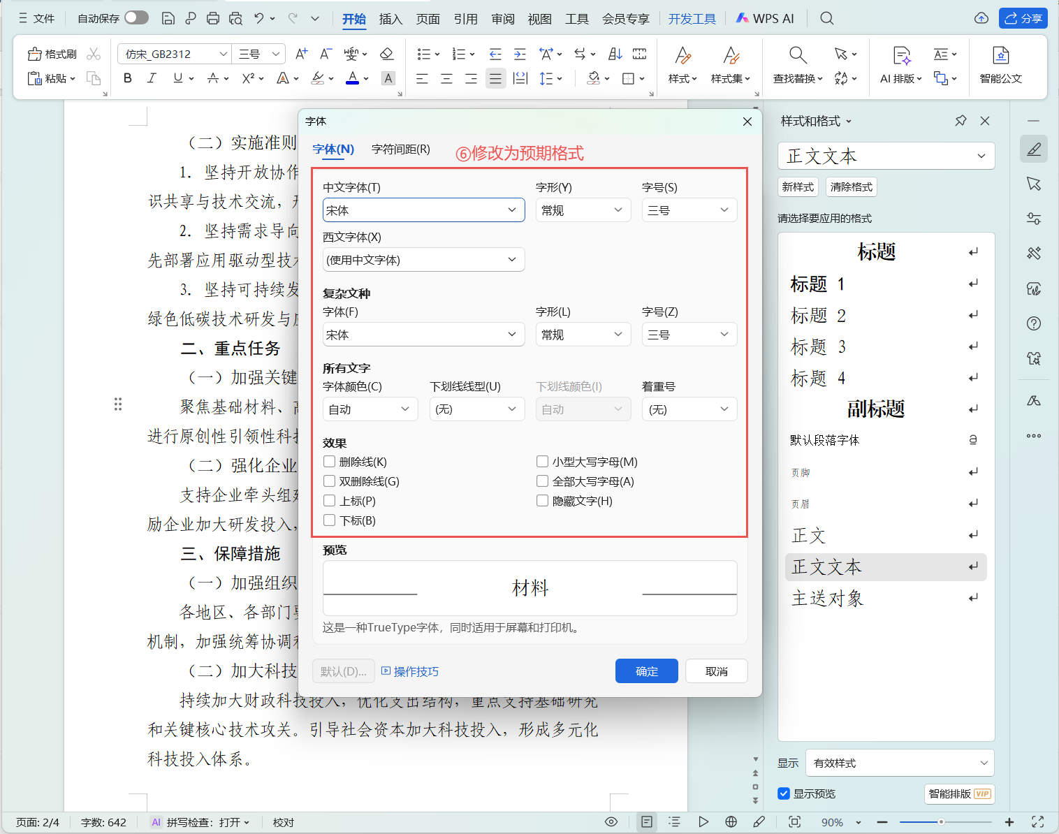 a. 按照下述步骤①-⑥修改“标题2”的字体为宋体,点击确定