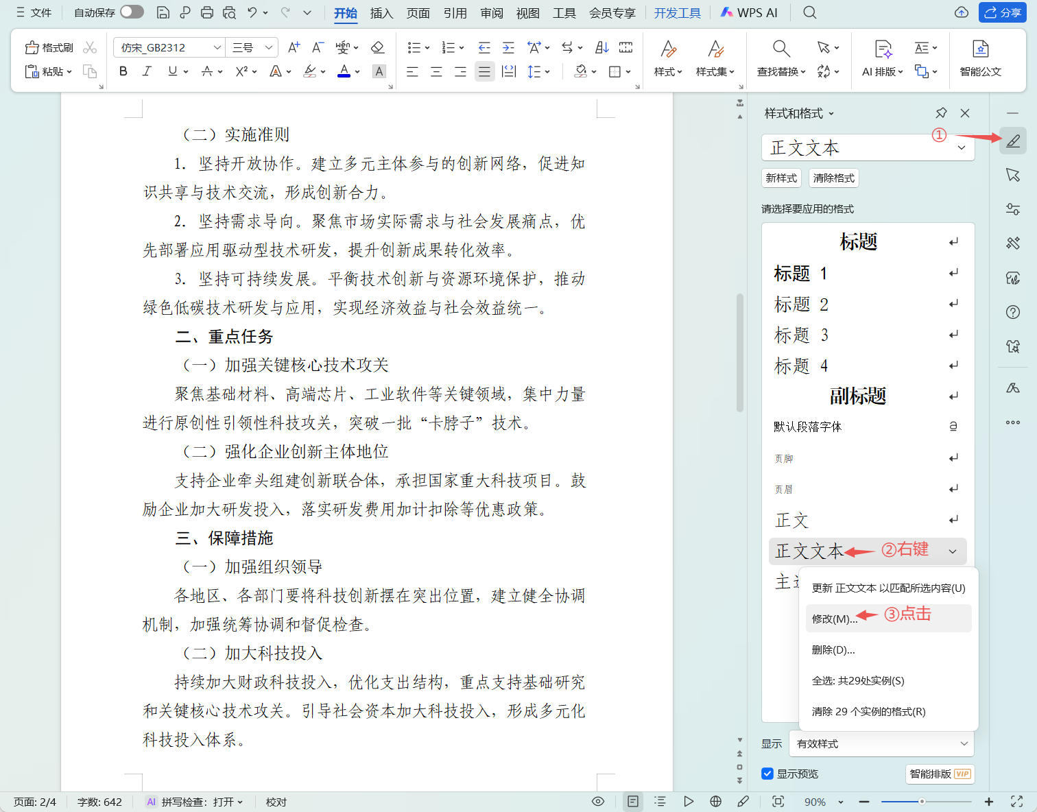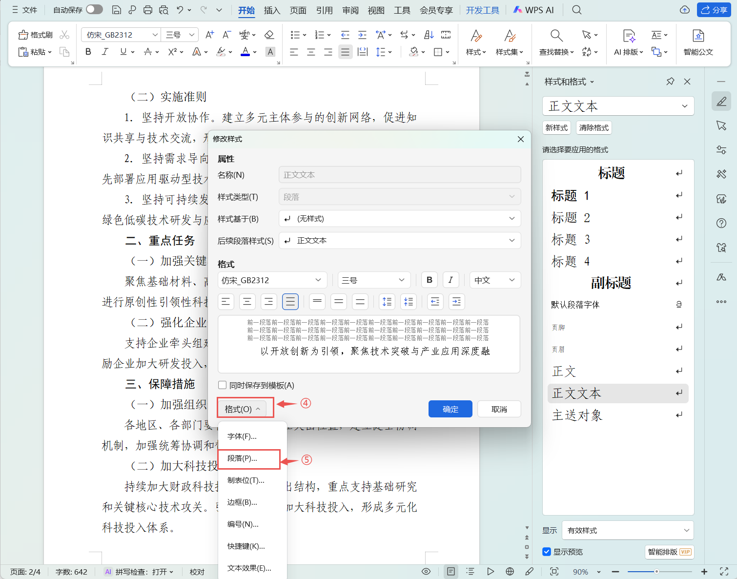 a. 按照下述步骤①-⑥修改“正文文本”的从“首行缩进2字符”修改为无,点击确定