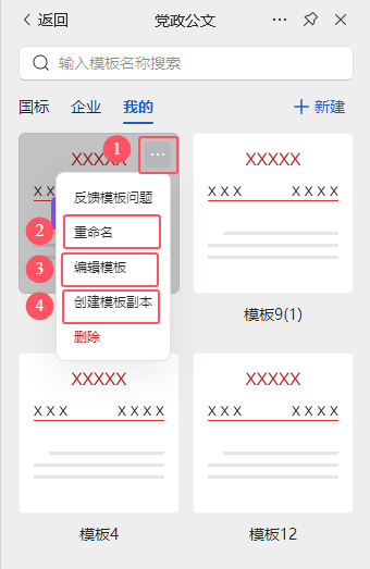 d. 回到公文排版界面,在【党政公文】界面-点击【我的】即可看到上面保存的模板,点击【开始排版】即可进行排版。