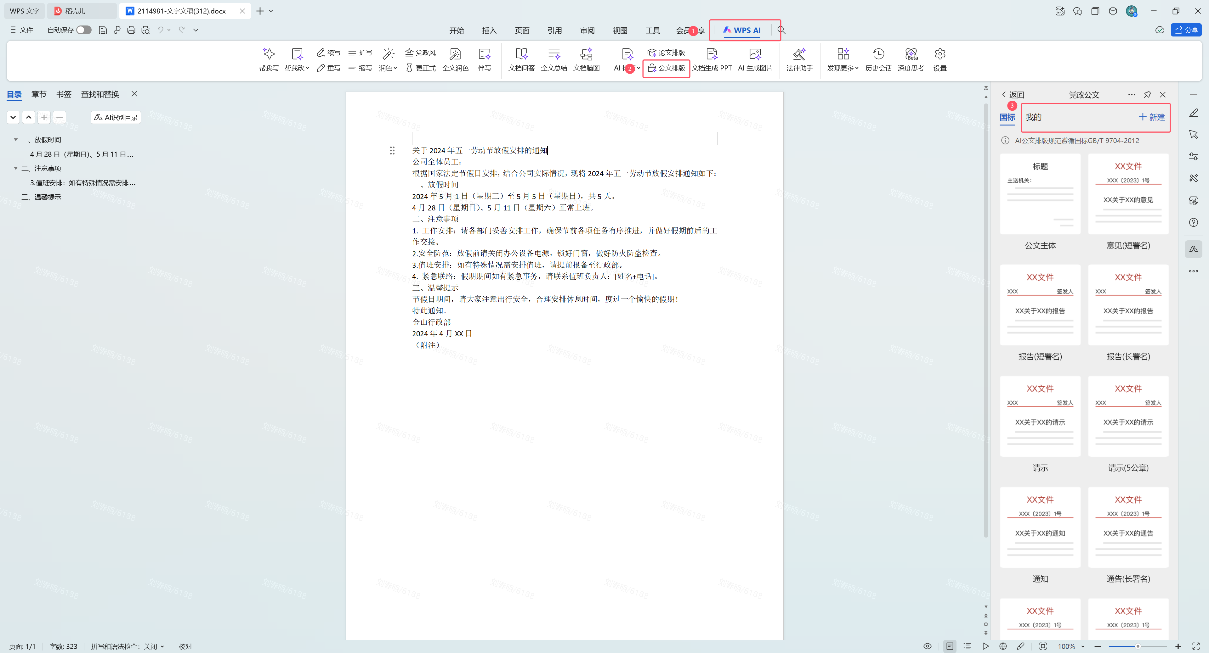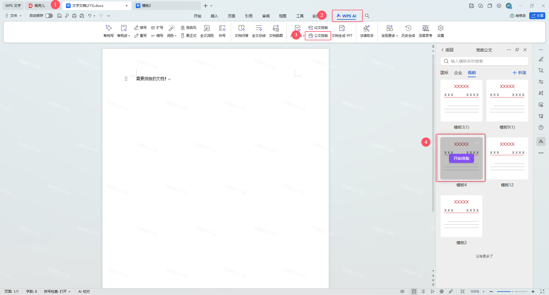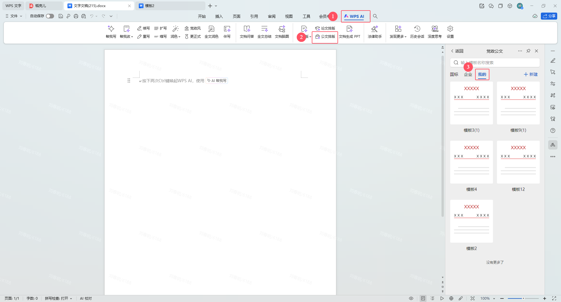 a. 依次点击选项卡【WPS AI】,【公文排版】,唤起右侧【党政公文】面板,点击新建即可进入到【自定义模板】界面