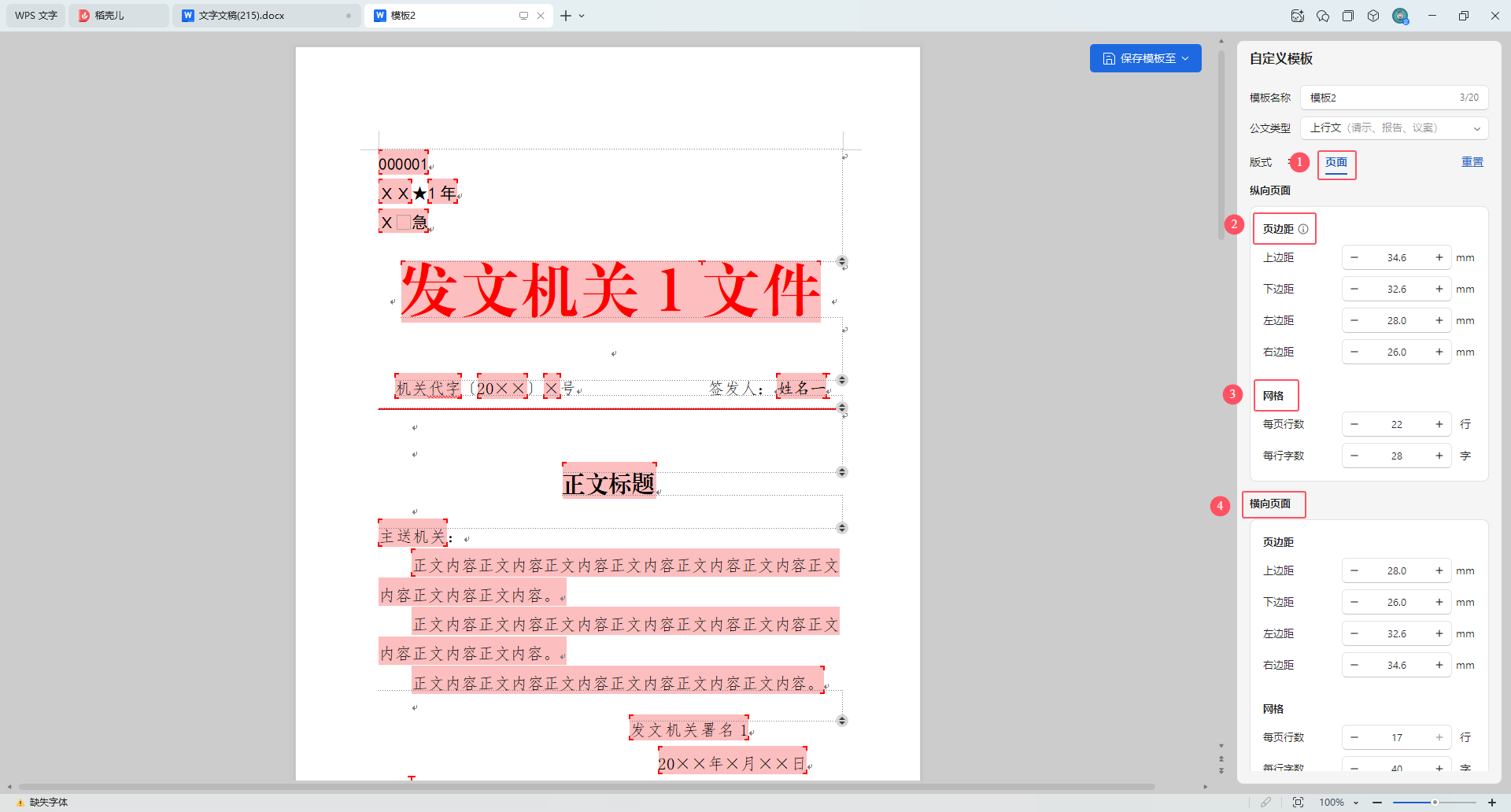 ④横向页面相关属性设置,对纵向排版模板无效,只会在排版时对横向文档生效