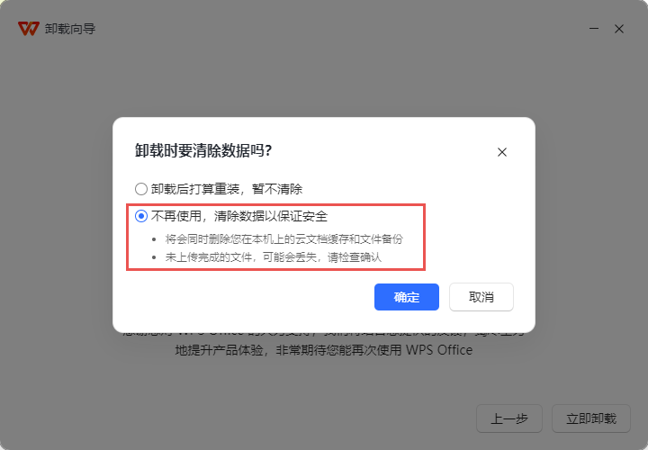 完全卸载wps : 卸载时选择【不再使用,清除数据以保证安全】进行卸载(操作前建议先保存下文件避免数据丢失)