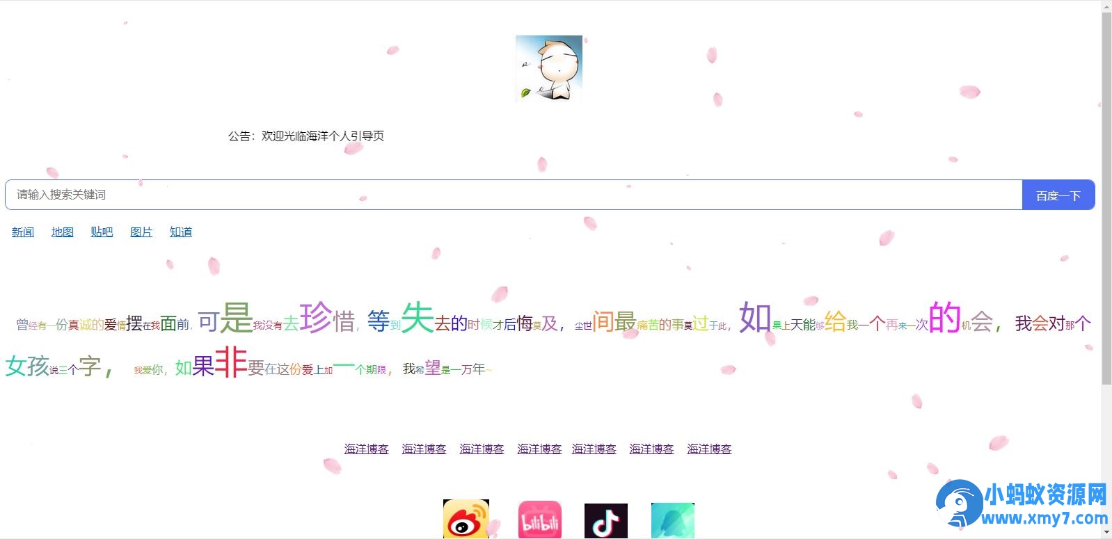 功能:含有公告、百度搜索、鼠标点击弹出爱心、樱花特效、访客统计。