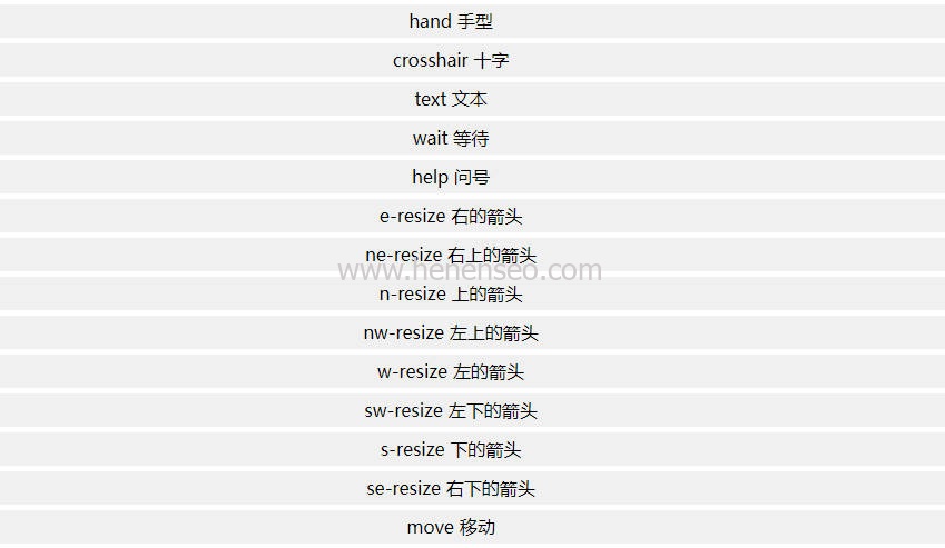 <span style="cursor:hand;">hand 手型</span> <span style="cursor:crosshair;">crosshair 十字</span> <span style="cursor:text;">text 文本</span> <span style="cursor:wait;">wait 等待</span> <span style="cursor:help;">help 问号</span> <span style="cursor:e-resize;">e-resize 右的箭头</span> <span style="cursor:ne-resize;">ne-resize 右上的箭头</span> <span style="cursor:n-resize;">n-resize 上的箭头</span> <span style="cursor:nw-resize;">nw-resize 左上的箭头</span> <span style="cursor:w-resize;">w-resize 左的箭头</span> <span style="cursor:sw-resize;">sw-resize 左下的箭头</span> <span style="cursor:s-resize;">s-resize 下的箭头</span> <span style="cursor:se-resize;">se-resize 右下的箭头</span> <span style="cursor:move;">move 移动</span>