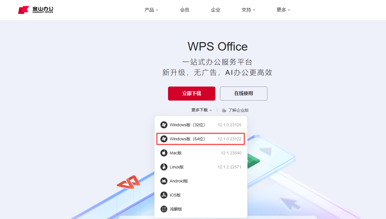 1、前往WPS官网下载安装Windows版(64位),参见下图。(如您频繁遇到此类问题,建议优先尝试该方法)